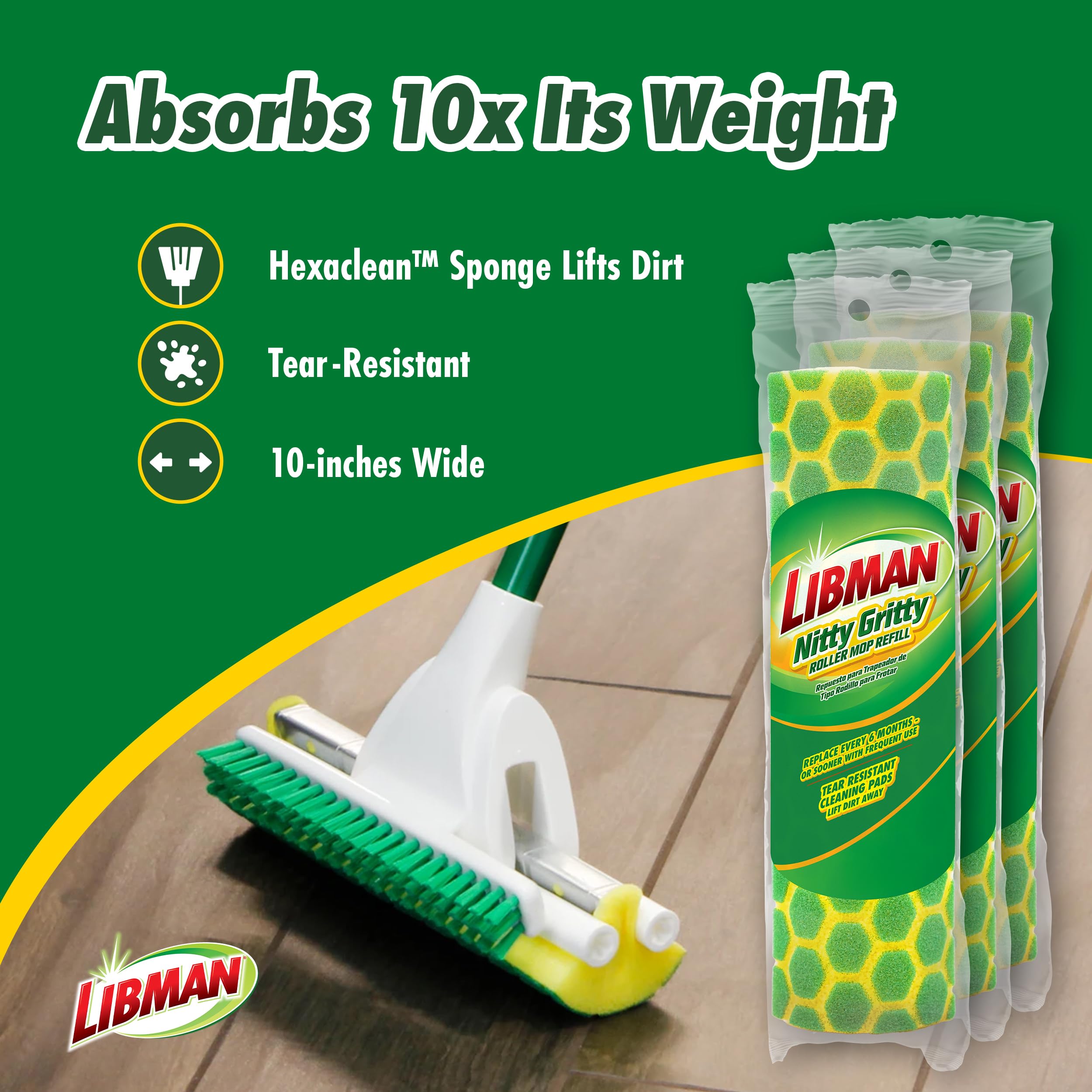 - INCLUDES 3 REFILLS: Includes three Libman Nitty Gritty Roller Mop head refills; single refill dimension (10” x 3.25” x 2.75”); replace every 6 months or sooner with frequent use; Family Made in USA