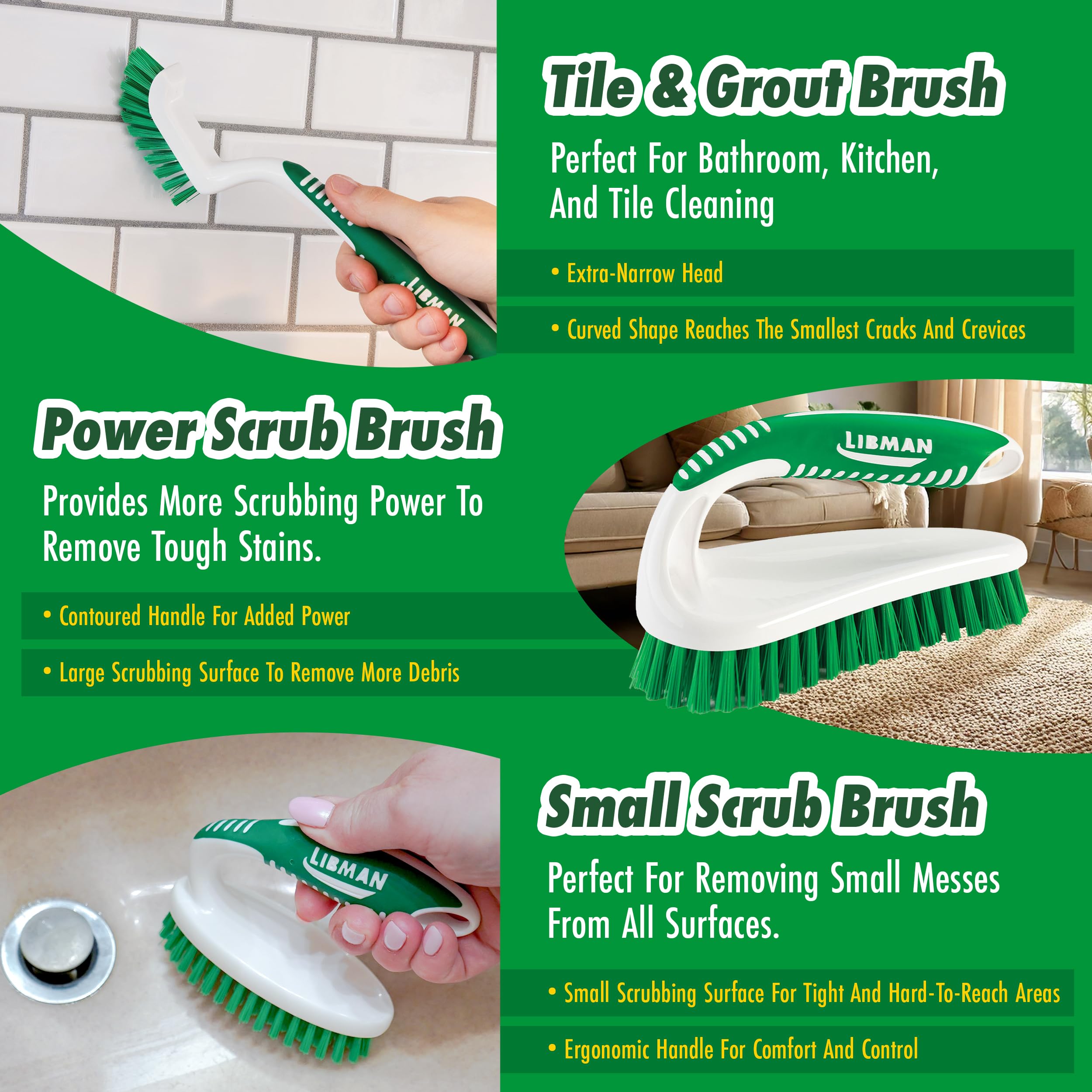 - SCRUB BRUSH SET FOR ALL YOUR CLEANING TASKS: The Libman Scrub Brush Kit includes a versatile bathroom and kitchen scrub brush designed to handle every cleaning task in your home; these scrub brushes for cleaning are perfect for deep, thorough cleaning